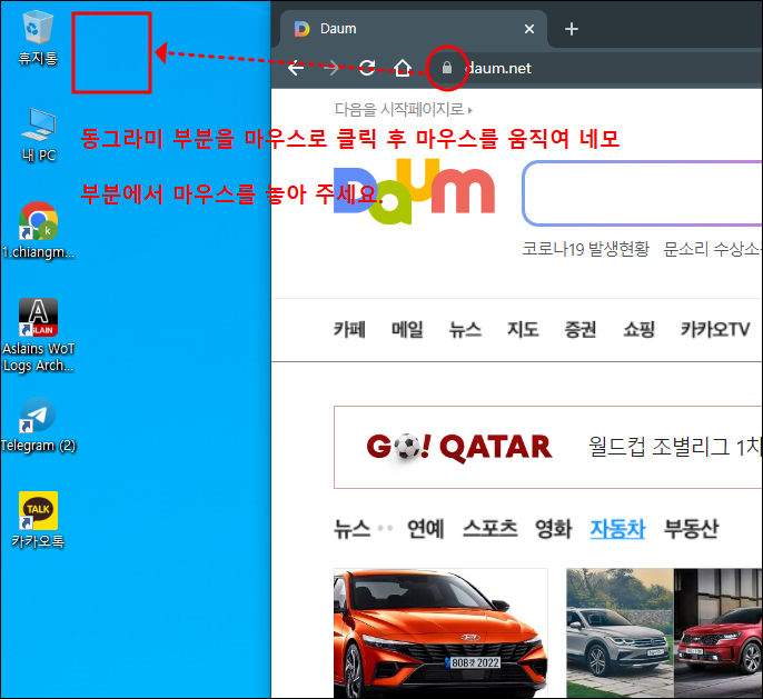 어떤 브라우저든지 열어서 다음 홈페이지로 접속해 주세요, 아래처럼 daum.net 앞쪽에 열쇠모양이 보이시면, 이걸 마우스로 클릭하신 후 바탕화면까지 끌고 나와서 마우스를 놓아 주세요.
