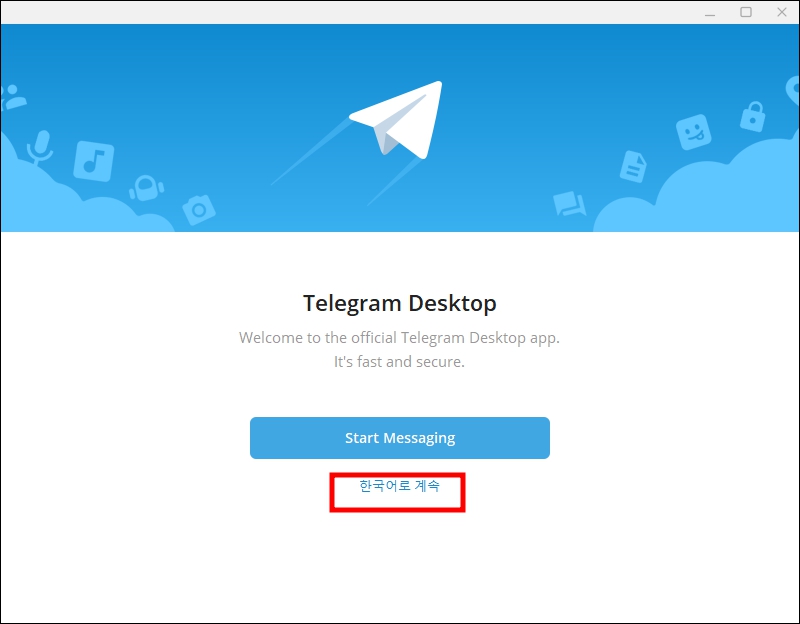 5. 텔레그램 pc버전 설치가 완료 되었고, 이제 아래와 같은 화면이 나오면, 한국어로 계속을 선택 합니다.