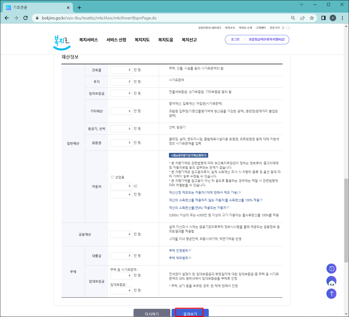 기본정보와 소득정보를 입력하신 후에, 화면을 아래로 내리시면, 아래와 같이 재산정보를 입력하는 화면을 보실 수 있습니다.