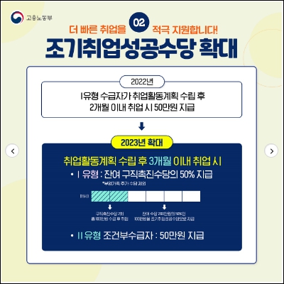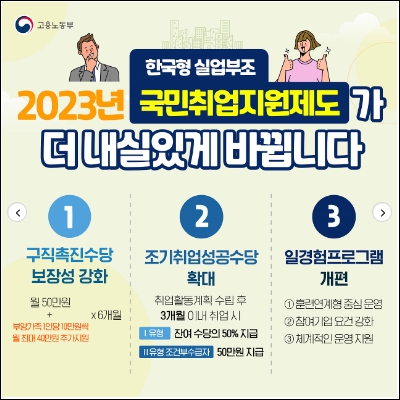 - 구직촉진수당(월 50만 원 ×6개월+부양가족* 1인당 10만 원씩 월 최대 40만 원 추가지원) 및 취업지원서비스 제공
