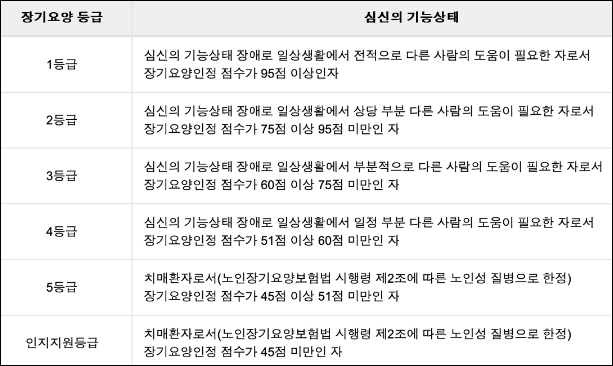 장기요양등급에 따라 노인 요양원 입소자격이 달라지게 됩니다. 아래에서 확인해 보세요. 참고로 노인 요양병원은 아래의 기준과 관계없이 비용만 지불하면 입소가 가능 합니다.