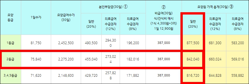 예를들어 2등급의 경우 30일 금액이 2,275,200원 이라면, 여기에 비급여 가격을 더하면 총 금액이 됩니다. 여기에서 본인부담금 20%를 적용하면 총 부담 금액이 842,040원이 됩니다.