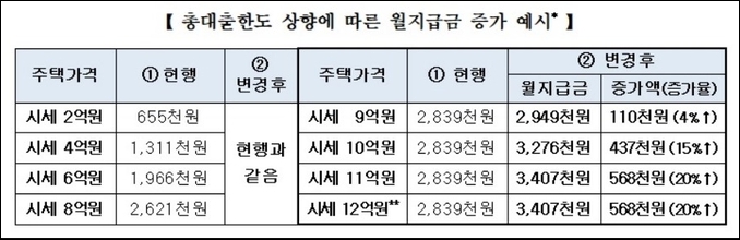 변경된 조건에 맞추어 주택공사가 제시한 예시에 따르면 주택연금 평균 가입 연령 72세(일반주택, 종신·정액형) 기준, 시세 12억원 주택의 경우 283만9000원에서 340만7000원으로 월지급액이 20% (56만8000원) 상승이 예상된다고 밝혔습니다.
