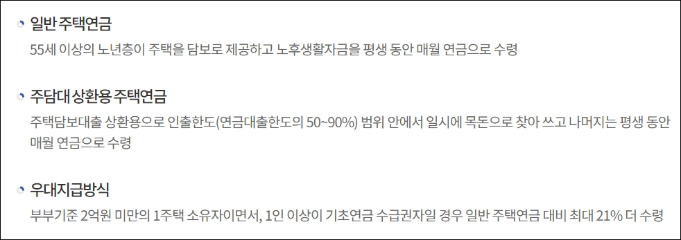 - 나중에 부부 모두 사망 후 주택을 처분해서 정산하면 되고 연금수령액 등이 집값을 초과하여도 상속인에게 청구하지 않으며, 반대로 집값이 남으면 상속인에게 돌아갑니다.
