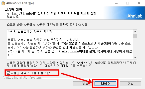 2) v3무료백신 사용권 계약에 동의해 주세요.
