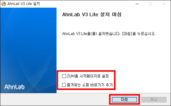 5) v3무료백신 설치가 마무리 되었습니다. 여기에서 그냥 마침을 누르면 줌이 시작페이지로 고정되고, 이샹한 쇼핑 바로가기가 추가되니 모두 해제 해주시고 마침 버튼을 눌러 주세요.