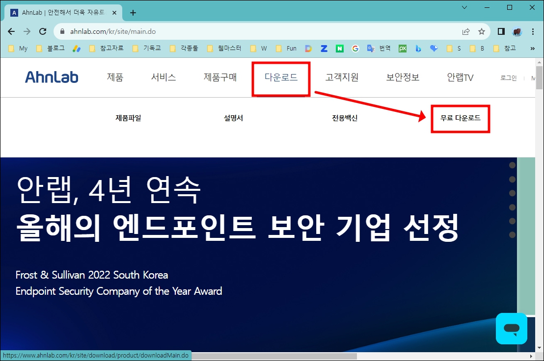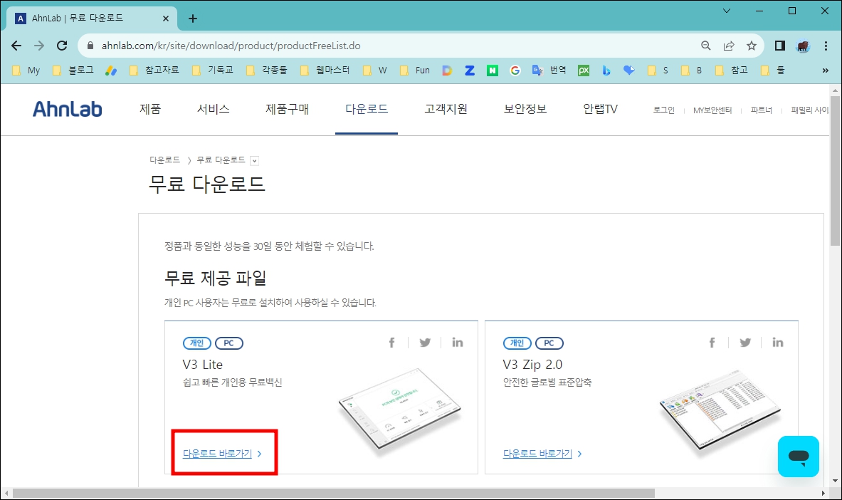 1. v3무료백신 다운로드를 위해 아래의 안랩 공식 웹페이지에 접속 합니다.