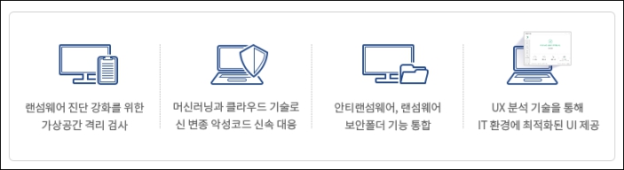 2. 랜섬웨어 탐지 및 차단부터 중요한 데이터 보호까지 - 별도의 추가 툴 설치 없이 V3 Lite 하나로 랜섬웨어 탐지 및 차단 가능 - 고스트 디코이(Ghost Decoy) 진단, 멀티레이어드 랜섬웨어 대응 체계로 더 정확한 랜섬웨어 탐지 - 안티랜섬웨어, 랜섬웨어 보안 폴더 등 다양한 기능으로 랜섬웨어 피해 원천 차단