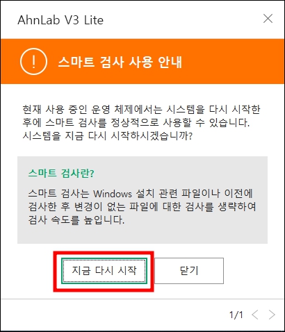 7) 이제 리부팅을 해주셔야 v3 스마트 검사를 진행한다고 합니다. 꼭 지금 리부팅 하실 필요는 없지만, 한번 리부팅 후 스마트 검사를 해주시길 추천 드립니다.