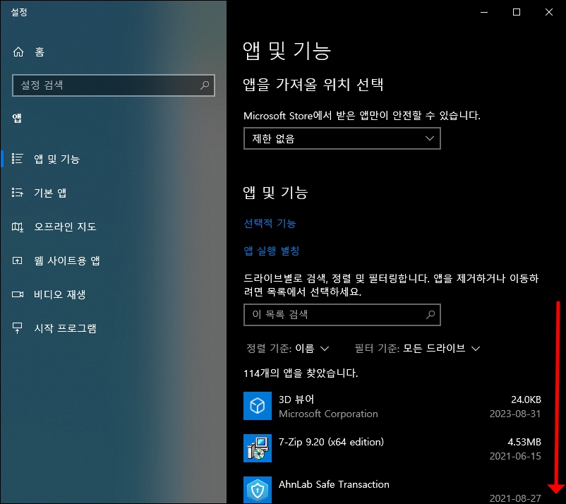 2. 컴퓨터에 설치된 프로그램이 나오면 v3 백신이 나올때까지 화면을 아래로 내려 주세요.