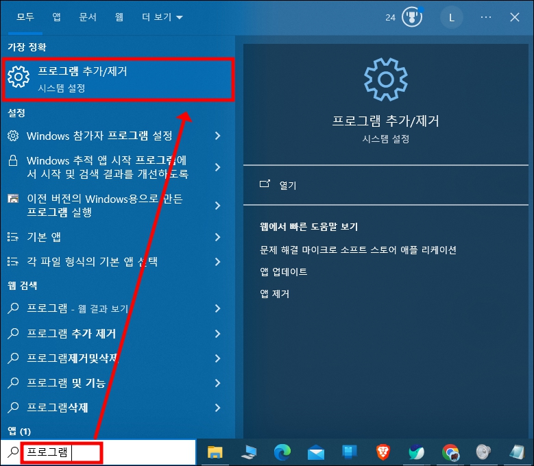 1. 윈도우 검색창에 프로그램 추가로 검색하여 아래처럼 톱니바퀴 프로그램 추가/제거를 선택 합니다.