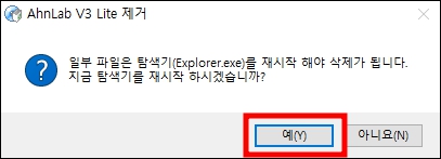 7. 아래의 메시지가 나오면 예를 눌러 v3백신 제거를 위해 탐색기를 재시작 합니다.
