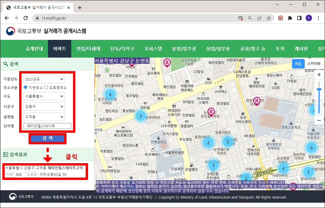 3) 아래의 화면이 나오면, 아파트 실거래가 조회를 원하는 기준연도, 주소, 단지명을 입력해 주세요. 제가 살고 있는 서울 강동구 고덕동의 아파트를 기준으로 조회를 해보도록 하겠습니다.