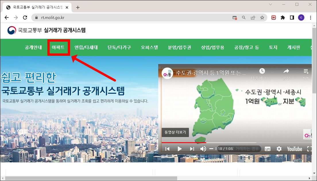 2) 아파트 실거래가 조회를 위해 아래의 국토교통부 화면에서 아파트 메뉴를 선택합니다.