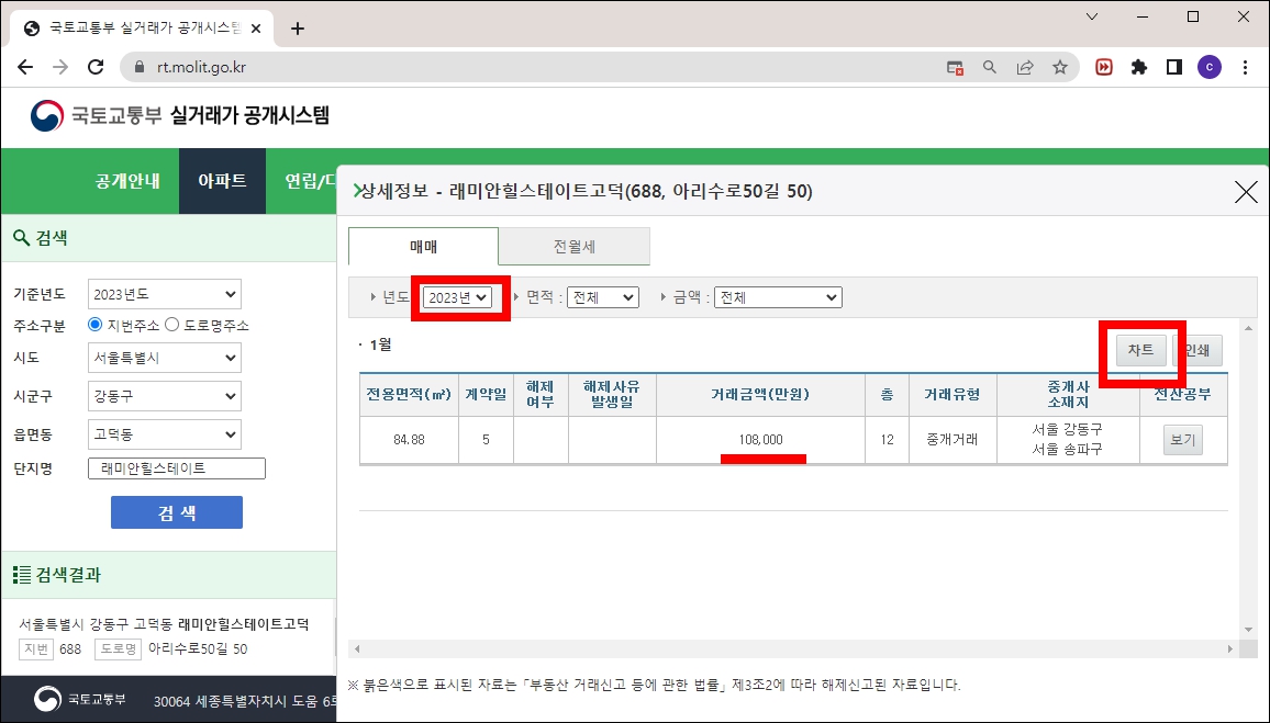 5) 연도별 아파트 실거래가 조회도 가능하고, 아파트가격 동향을 보기 위한 차트 기능도 제공하고 있습니다.