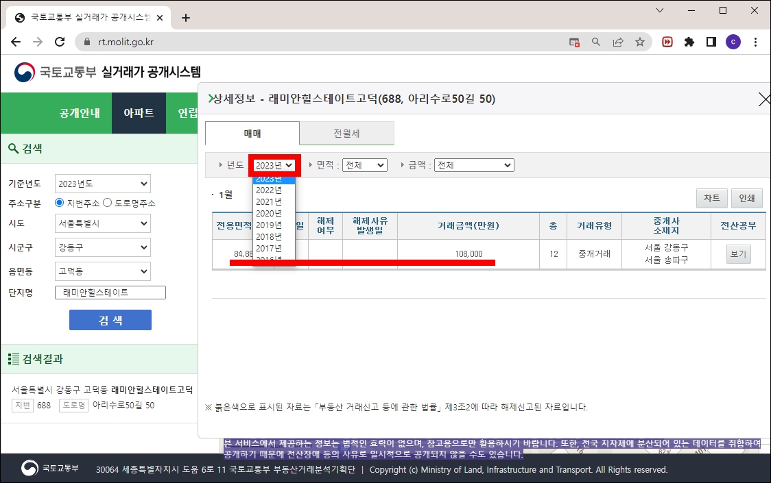 4) 아래와 같이 84.83 타입의 경우, 2023년에 실거래 금액 확인이 가능합니다. 이전 연도 실거래 금액을 확인하고자 하시면, 아래의 그림처럼 년도 부분을 눌러서 해당 연도를 선택합니다.